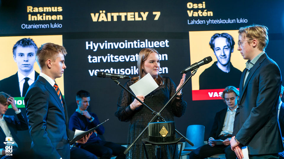 Ossi Vatén väitteli aiheesta Hyvinvointialueet tarvitsevat oman verotusoikeuden vastaparinaan Rasmus Inkinen Otaniemen lukiosta.