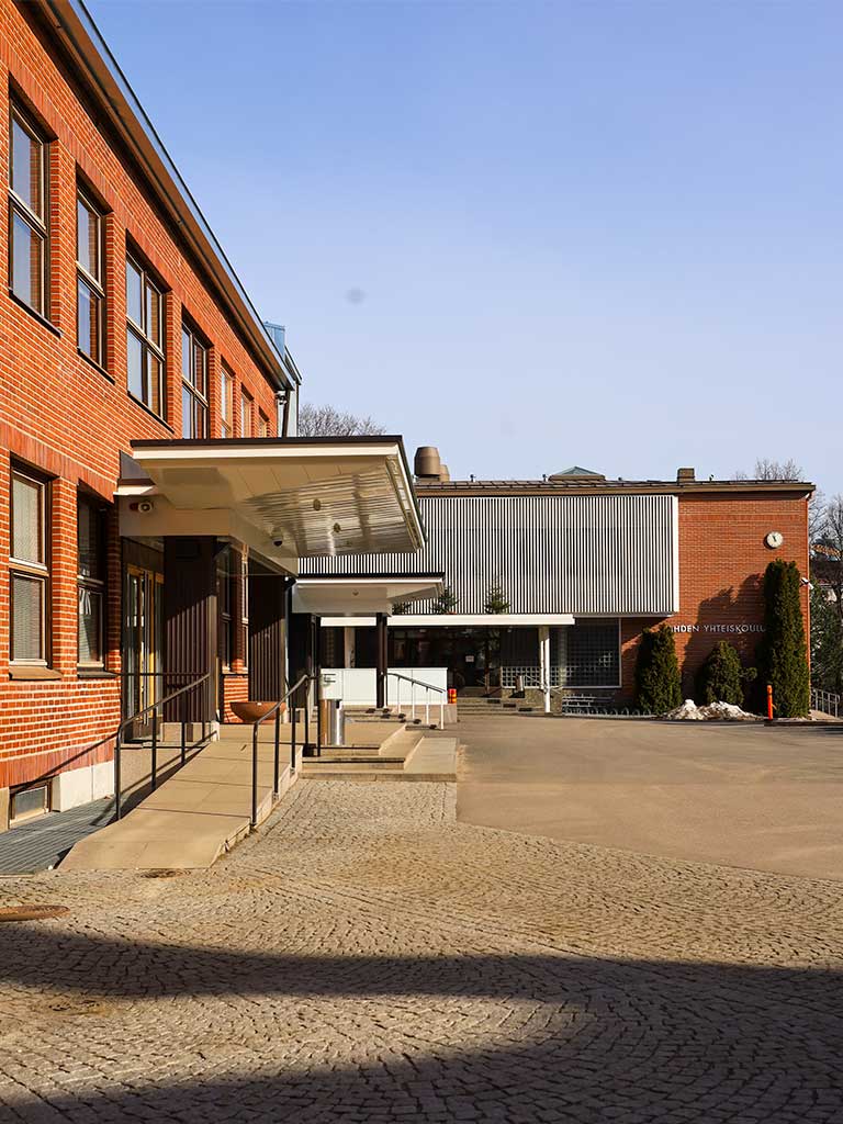 Lahden yhteiskoulun pihapiiriä, jossa etualalla näkyy punatiilinen koulurakennus ja sen sisäänkäynti katoksineen. Taustalla on modernimpi, vaaleasävyinen rakennusosa, jonka julkisivussa on pystysuoria metallirimoja. Piha-alue on avara ja päällystetty, ja sen reunoilla on istutuksia sekä matalia pensaita.