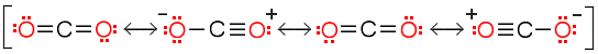 Hiilidioksidimolekyylin sidosrakenteen kuvaaminen täsmällisesti sidosviivoilla ja vapailla elektronipareille on hieman hankalaa. Joskusrakenen esitetään neljän resonanssimuodon avulla. Kunkin muodon arvellaan vaikuttavan 25 %:n osuudelta resonanssihybridiin.